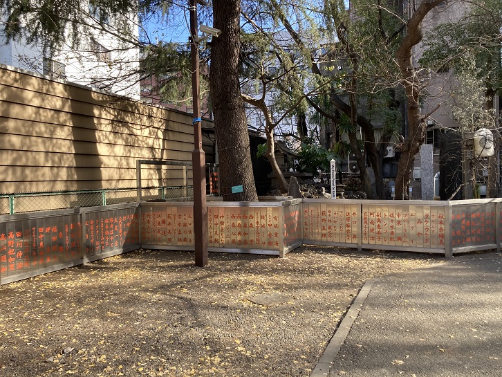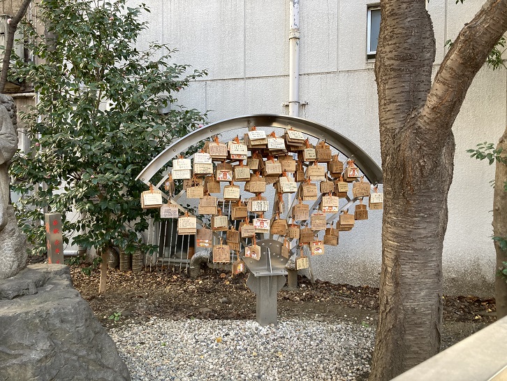 芸能浅間神社はその名の示す通り、江戸の昔から芝居や舞踊の興行に縁が深かったため、演劇や歌曲など芸能関係の奉納が多いことで有名です。社の周囲には奉納した芸能人の名前が書かれたプレートがずらりと並んでいます。八代亜紀・ビリー・バンバン・中川翔子・唐十カ・ビートたけし等に混じって、NMB48加藤夕夏さんの名前もあります。昭和から平成にかけて活躍した芸能人が数多く名前を連ねていますが、プレートは差し替えできそうなので随時更新されるのかも。これから芸能人を目指す若者達の絵馬も沢山奉納されています。願いが叶うといいですね。
