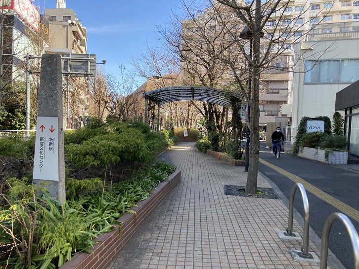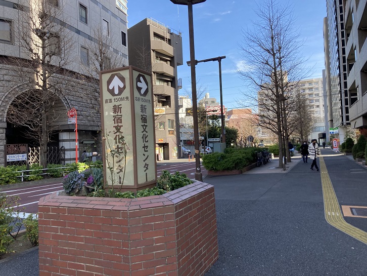 道路の脇に近隣の名所を記した案内板が立っています。新宿文化センターは新宿区立の複合文化施設で、大・小各ホールやリハーサル室・会議室・展示室・レストランなどがあります。ホールでは区関係のイベントの他、オーケストラコンサート・バレエ・ミュージカルなどの公演も多く行われ、新宿区内外を問わず多くの利用者が訪れる施設になっています。