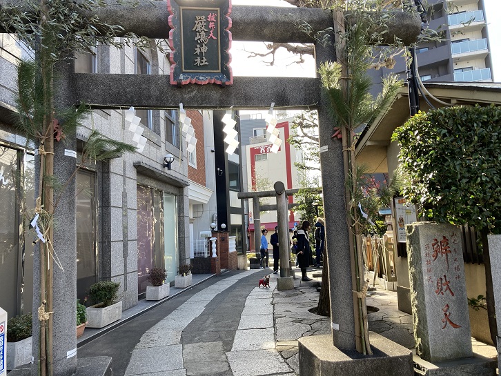 文化センター通りから抜弁天通りに入ります。その正面に抜弁天嚴嶋神社が鎮座しています。抜弁天は今はもう地名のようになっていますが、その昔、源義家が戦勝祈願した嚴嶋神社のことです。この近くを旧鎌倉街道が通っていたために源義家の伝説があるのだといわれています。境内が南北に通り抜けできることから、苦難を切り抜けられる弁天社、いわゆる抜弁天として庶民から信仰され、江戸六弁天として、また新宿山ノ手七福神のひとつになっています。嚴嶋神社は七福神唯一の女神で、金運・縁結び・芸事上達の神である弁財天を祀っています。