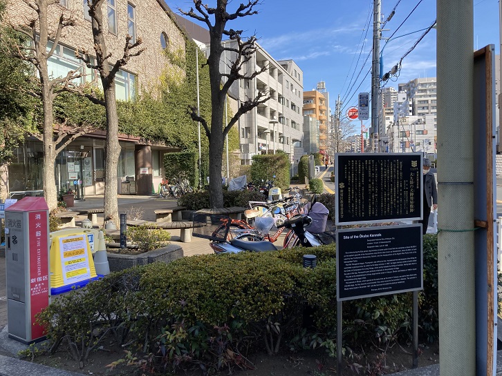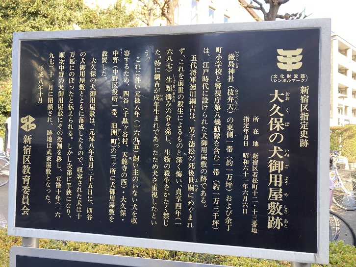 For a time during the Edo period, dog kennels occupied a piot of land that now comprises of about 33,000mxm on the eastern grounds of the Itsukushima Jinja Shrine (also known as Nukebenten), about 43,000mxm of land used by the Yochomachi Elementary School, and the headquarters of the Eighth Riot Police Unit of the Metropolitan Police. The fifth Tokugawa shogun, Tsunayoshi, was without an heir. He believed this was because of the killings he committed in previous lives. for which he felt deep remorse. In 1687, he began issuing a series of edicts called the Order of Compassion for Living Things, which strictly forbado the killings of animals. Having been born in the year of the dog Tsunayoshi gave particular emphasis on the protection of dogs. This led to the establishment of three large kennel areas in Yotsuya, Okubo, and Nakano in 1695 to house the numerous stray dogs in Edo. The kennels in Okubo, which opened at the same time as the ones in Yotsuya, are said to have held some 100,000 dogs. As they became overcrowded, they were moved to the kennels in Nakano. The kennels in Okubo were closed in November 1697, and the land was converted into samural residences.