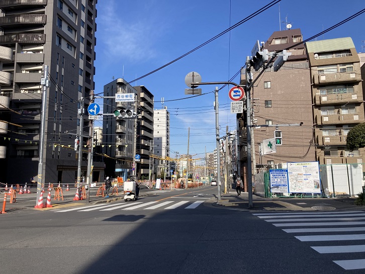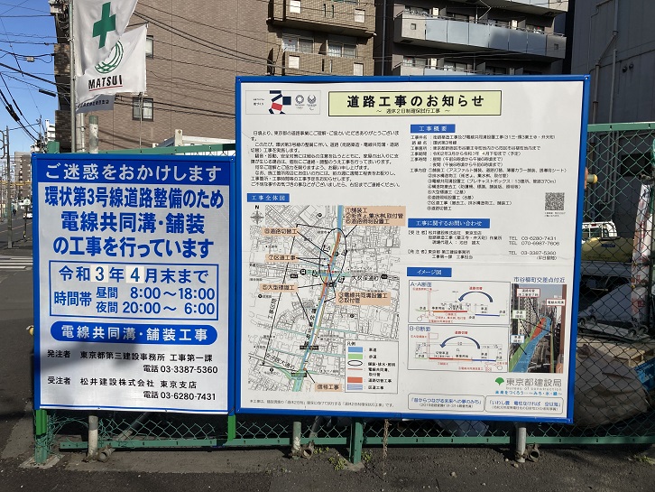 外苑東通り(環状第3号線)と大久保通りが交差している地点が市谷柳町交差点です。外苑東通りは南北に亘って長いこと道路の拡幅・整備工事が続いています。この区間では、道路工事と同時に電線共同溝の工事も行われています。電線を地下に通し、電柱のない街になるのでしょうか?