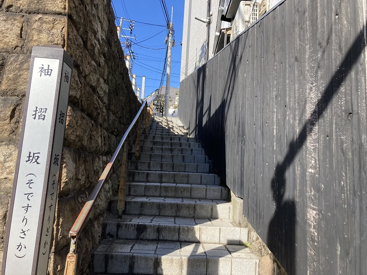 俗に袖摺坂と呼ばれ、両脇が高台と垣根の狭い坂道で、すれ違う人がお互いの袖を摺り合わしたという(「御府内備考」)。