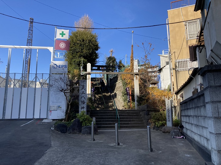 筑土八幡神社は大久保通りから一歩奥に入ったところにあります。境内にある宮比神社の御祭神「天鈿女命」は、日本神話に登場する芸能の神として知られています。太陽の神である「天照大神」が、弟の「素戔嗚尊」の粗暴な行為を目の当たりにし、天岩戸に隠れてしまった際、面白おかしく踊り、「天照大神」を再び御出現させた神が「天鈿女命」です。一説では別名「宮比神」と呼ばれていることから、神社の名称の由来となったといわれています。八百万の神を笑わせた神として、今でいう芸人や俳優の元祖ともいわれ、学芸の上達や、商売繁盛・縁結び・合格祈願などの御利益があるとされる神社です。