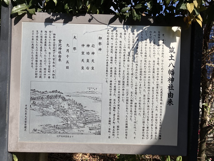 昔、嵯峨天皇の御代(今から約千二百年前)に武蔵国豊嶋郡牛込の里に大変熱心に八幡神を信仰する翁がいた。ある時、翁の夢の中に神霊が現われて、「われ、汝が信心に感じ跡をたれん。」と言われたので、翁は不思議に思って、目をさますとすぐに身を清めて拝もうと井戸のそばへ行ったところ、かたわらの一本の松の樹の上に細長い旗のような美しい雲がたなびいて、雲の中から白鳩が現われて松の梢にとまった。翁はこのことを里人に語り神霊の現われたもうことを知り、すぐに注連縄をゆいまわして、その松を祀った。その後、伝教大師がこの地を訪れた時、この由を聞いて、神像を彫刻して祠に祀った。その時に筑紫の宇佐の宮土をもとめて礎としたので、筑土八幡神社と名づけた。さらにその後、文明年間(今から約五百年前)に江戸の開拓にあたった上杉朝興が社壇を修飾して、この地の産土神とし、また江戸鎮護の神と仰いだ。現在、境内地は約二千二百平方米あり、昭和二十年の戦災で焼失した社殿も、昭和三十八年氏子の入々が浄財を集めて、熊谷組によって再建され、筑土八幡町・津久戸町・東五軒町・新小川町・下宮比町・揚場町・神楽河岸・神楽坂四丁目・神楽坂五丁目・白銀町・袋町・岩戸町の産土神として人々の尊崇を集めている。