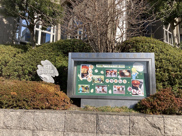 都立工芸高等学校の校舎は高校とは思えないほどの立派な建物です。1997年に改修を実施した地上9階・地下2階の校舎で、校外にオニヒトデのような赤いオブジェがあります。これは炎を意味していますが、建築家のコンセプトであり、学校の意思とは関係がないそうです。このオブジェは風力で回転し、一部生徒の間で「校長が自転車をこいで回転させている」という説が未だに残っているとか。この赤いオブジェの他にも、校内には卒業生の芸術家などの数々の芸術作品や伝統工芸品が展示されています。掲示板には、全日制アートクラフト科による銅鍋制作の成果が張り出されています。肉じゃがにあんことあったので、てっきり料理の実習かと思っていましたら、制作した鍋の出来映えを試していたんですね。銅鍋は熱伝導率が高いので、肉じゃがもよく煮込めたのではないでしょうか?