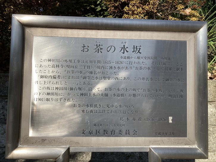 この神田川の外堀工事は元和年間(1615年〜1626年)に行われた。それ以前に、ここにあった高林寺(現向丘二丁目)の境内に湧き水があり”お茶の水”として将軍に献上したことから、「お茶の水」の地名がおこった。「御府内備考」によれば「御茶之水は聖堂の西にあり、この井戸水にして御茶の水に召し上げられしと・・・」とある。この坂は神田川(仙台堀)に沿って、お茶の水の上の坂で「お茶の水坂」という。坂の下の神田川に、かって神田上水の大樋(水道橋)が懸けられていたが、明治三十四年(1901年)取りはずされた。