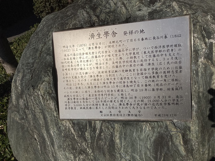 順天堂大学の隣に建つセンチュリータワーとその北側の給水場公苑に挟まれた道路の脇に石碑が置かれています。明治初期に医師(西洋医)になるには、大学の医学部を卒業するか、”医術開業試験”を直接受験するかのふたつの方法がありました。濟生學舎はその試験を受験するための予備校的な医学校でした。濟生學舎は明治九年に長谷川泰により設立され、その後30年間でおよそ1万人の医師を世の中に送り出したといわれ、一説によるとこの時代の医師の半数を養成したとされています。濟生學舎に学んだ人には、野口英世・吉岡弥生・荻野吟子などの名前が見られます。明治三十六年に濟生學舎は大学に昇格するべく申請しましたが果たせず閉鎖されました。現在の日本医科大学・日本女子医科大学・東京医科大学などは濟生學舎の流れをくんでいます。
