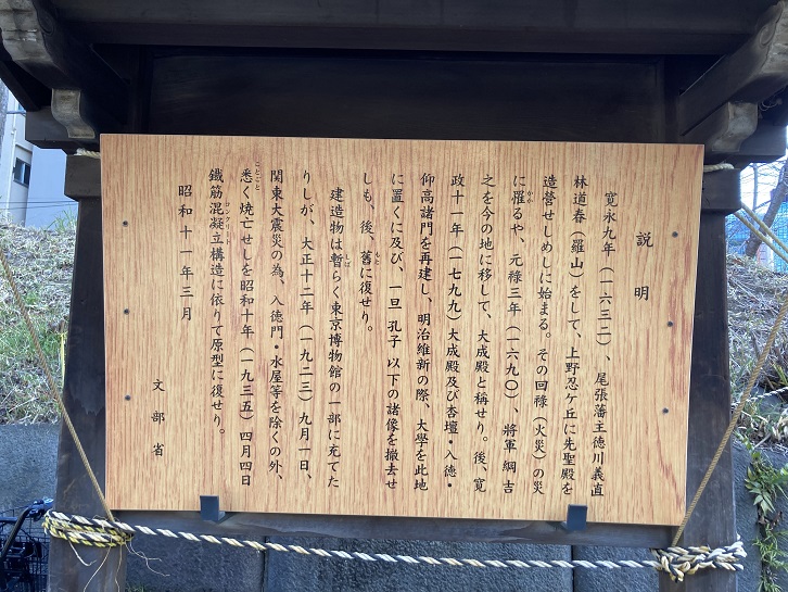 寛永九年(1632年)、尾張藩主コ川義直林道春(羅山)をして、上野忍ケ丘に先聖殿を造營せしめしに始まる。その回祿(火災)の災に罹るや、元祿三年(1690年)、將軍綱吉之を今の地に移して、大成殿と稱せり。後、寛政十一年(1799年)大成殿及び杏壇・入コ・仰高諸門を再建し、明治維新の際、大學を此地に置くに及び、一旦孔子以下の諸像を撤去せしも、後、舊に復せり。建造物は暫らく東京博物館の一部に充てたりしが、大正十二年(1923年)九月一日、関東大震災の為、入コ門・水屋等を除くの外、悉く焼亡せしを昭和十年(1935年)四月四日鐵筋混凝立構造に依りて原型に復せり。