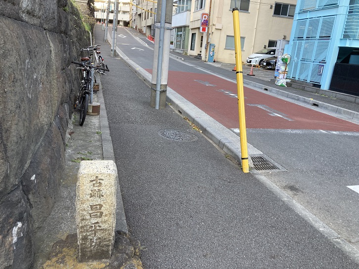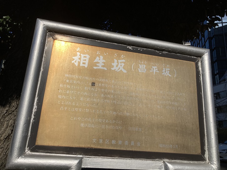 湯島聖堂の東側の塀に沿って短い坂があります。本来の昌平坂はこちらの方で、神田川に沿って湯島聖堂の正面にある坂は相生坂と呼ばれていたようです。私が持っている地図には両方の坂を区別して記載してあります。なので、案内板のタイトルは「相生坂・昌平坂」にするのがいいかと思うのですが。