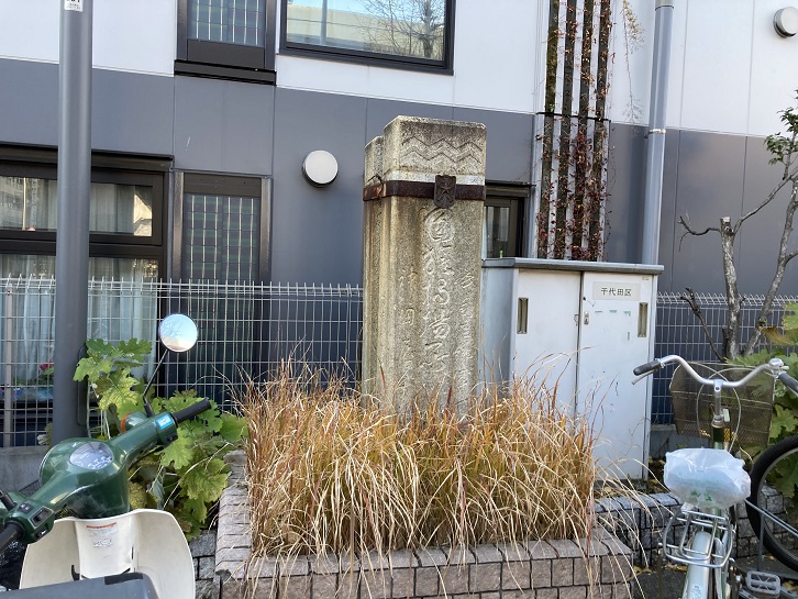 和泉橋の袂に石碑が建っています。文字が書かれていますが読み取れませんね。案内板に「江戸城外掘(現在の神田川)南岸に築かれていた土手」とありますので、土手の名残の記念碑なのでしょうか?