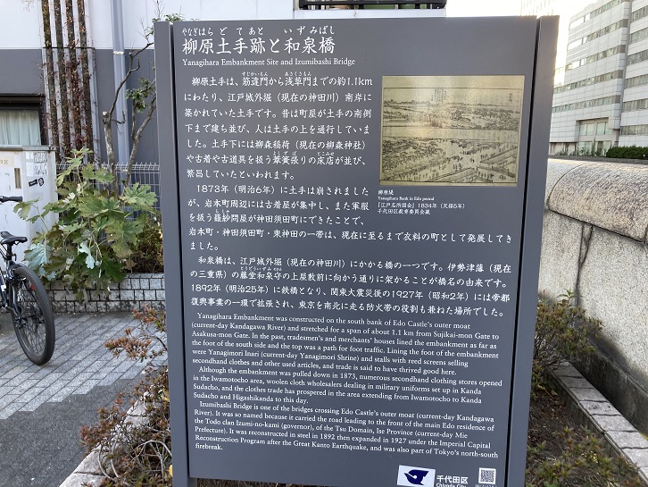 Yanagihara Embankment was constructed on the south bank of Edo Castle's outer moat (current-day Kandagawa River) and stretched for a span of about 1.1 km from Sujikai-mon Gate to Asakusa-mon Gate. In the past, tradesmen's and merchants' houses lined the embankment as far as the foot of the south side and the top was a path for foot traffic. Lining the foot of the embankment were Yanagimori Inari (current-day Yanagimori Shrine) and stalls with reed screens selling secondhand clothes and other used articles, and trade is said to have thrived good here. Although the embankment was pulled down in 1873, numerous secondhand clothing stores opened in the Iwamotocho area, woolen cloth wholesalers dealing in military uniforms set up in Kanda Sudacho, and the clothes trade has prospered in the area extending from Iwamotocho to Kanda Sudacho and Higashikanda to this day. Izumibashi Bridge is one of the bridges crossing Edo Castle's outer moat (current-day Kandagawa River). It was so named because it carried the road leading to the front of the main Edo residence of the Todo clan Izumi-no-kami (governor), of the Tsu Domain, Ise Province (current-day Mie Prefecture). It was reconstructed in steel in 1892 then expanded in 1927 under the Imperial Capital Reconstruction Program after the Great Kanto Earthquake, and was also part of Tokyo's north-south firebreak.