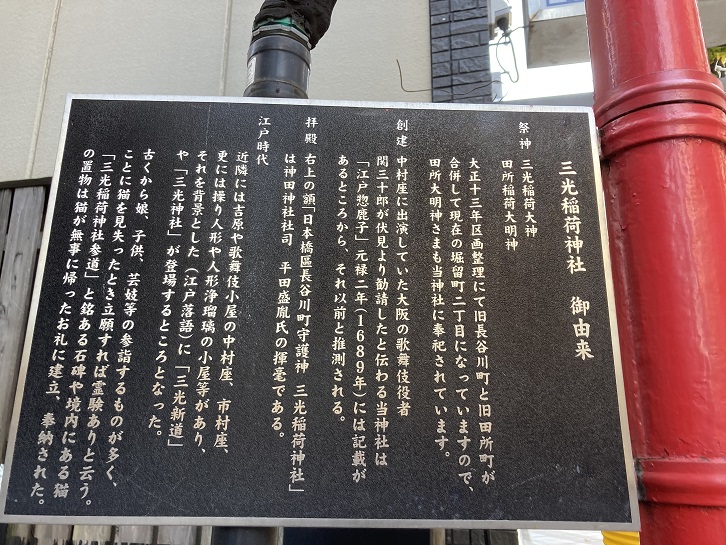 近隣には吉原や歌舞伎小屋の中村座・市村座、更には操り人形や人形浄瑠璃の小屋等があり、それを背景とした(江戸落語)に「三光新道」や「三光神社」が登場するところとなった。古くから娘・子供・芸妓等の参詣するものが多く、ことに猫を見失ったとき立願すれば霊験ありと云う。「三光稲荷神社参道」と銘ある石碑や境内にある猫の置物は猫が無事に帰ったお礼に建立・奉納された。