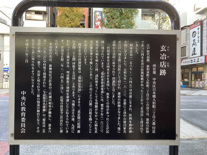 江戸時代初期、新和泉町(人形町三丁目)のこの辺りは、幕府の医師であった岡本玄冶の拝領屋敷があったことから「玄治店」と呼ばれていました。岡本玄冶(1587年〜1645年)は京都に生まれ、医術を曲直瀬玄朔に学びました。元和九年(1623年)、京都に上洛中の徳川家光が江戸へ帰る際に侍医として招かれ、幕府の医師となりました。後に法眼から法印に叙せられて啓迪院(けいてきいん)と号しました。三代将軍家光は岡本玄治を重用し、数多くの功があったことが記録に残されています。「寛政重修諸家譜」には、寛永十年(1633年)、家光が大病を病んだ時、諸医術をつくしても効験がなかった病を玄冶が薬を奉り平癒したとあり、この功により白銀二百枚を賜ったことが記されています。岡本玄冶の拝領屋敷は「寛保沽券図」によると、「表京間六拾間 裏行京間二十五間 坪数千五百坪」とあります。当地にはその後、九代にわたって子孫が住み、明治維新で地所を奉還したと伝えられています。玄冶は正保二年(1645年)に没し、広尾の祥雲寺(渋谷区)に葬られました。玄冶店の名は、歌舞伎狂言作者の三代瀬川如皐が脚色し、嘉永六年(1853年)に中村座で初演された「与話情浮名横櫛」の「源氏店(玄治店)の場」の一幕で、お富と切られ与三郎の情話の舞台となり、その名が広く世に知られるようになりました。