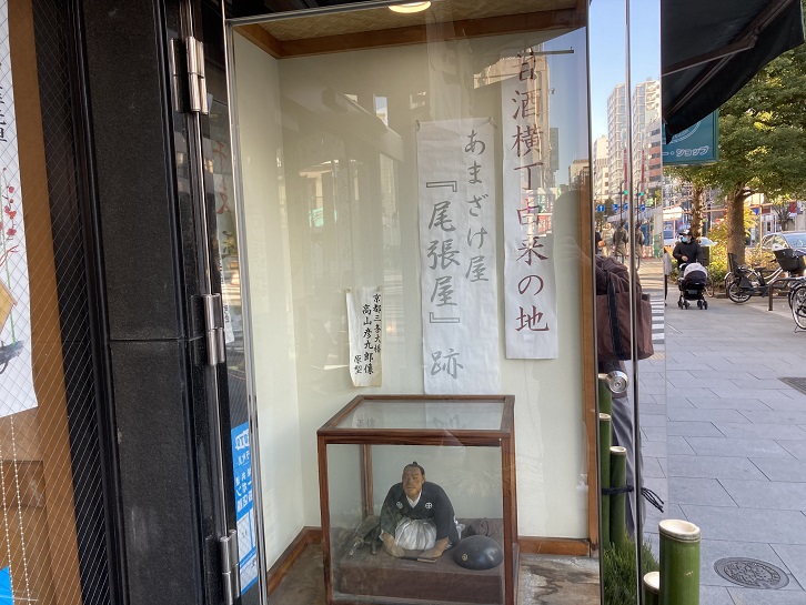 人形町といえば甘酒横丁ですね。甘酒横丁は、明治の頃に今の甘酒横丁入口付近に「尾張屋」という甘酒屋さんがあって、その小路を「甘酒屋横丁」と呼んでいたのが地名の起源のようです。そのころから、人形町にあった寄席や明治座の芝居帰りの見物客で賑わっていました。関東大震災の後で道路が広げられましたが、今でもこの路地は「甘酒横丁」と呼ばれ親しまれています。甘酒横丁には老舗が何軒もありますが、大正五年(1916年)創業の柳屋は全身をリズミカルに動かしながら焼く鯛焼が評判で、店先には連日長蛇の列ができます。鯛焼の命はあんこにあるという信念のもと、十勝産の小豆を厳選し、毎日必要量だけを店内で製造して熱々の出来たてのあんこを使用しているとのことです。火床での滞留時間が短く、水分が飛ばないためにしっとりと洗練された味わいが醸し出されます。東京のたい焼き御三家といえば、麻布が本店の「浪花家総本店」、四谷見附の「わかば」、ここ柳屋といわれています。甘酒の尾張屋は昭和の終わり頃まで商売していましたが、現在はその跡地が王英堂という和菓子屋さんになっていて、お店の入口横にここが尾張屋だったことを展示しています。