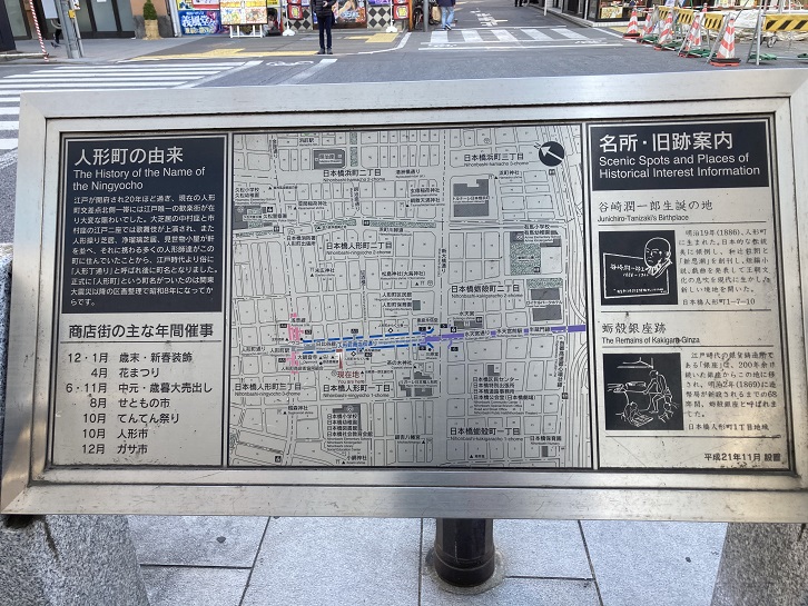 人形町の名所・旧跡案内板がふたつあります。芸能・文学・金融、はては富籤まで人形町には多様な文化がありました。