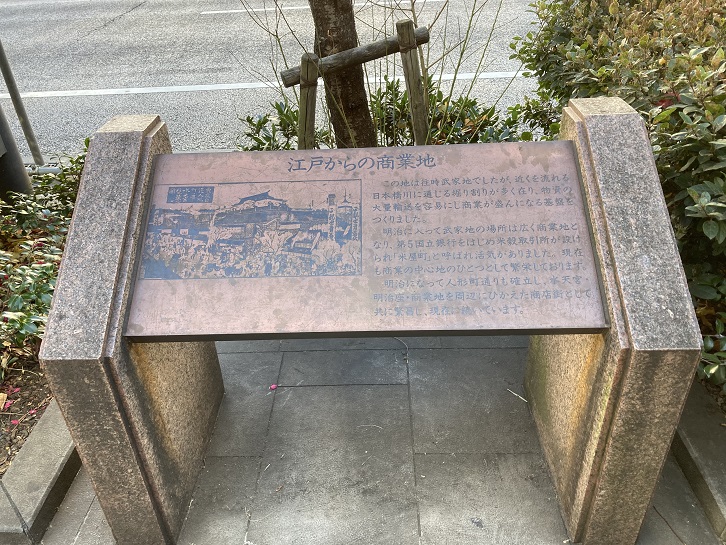 道路の脇に人形町の案内板が置かれています。第五国立銀行は統合や合併を繰り返して、現在の三井住友銀行になっています。