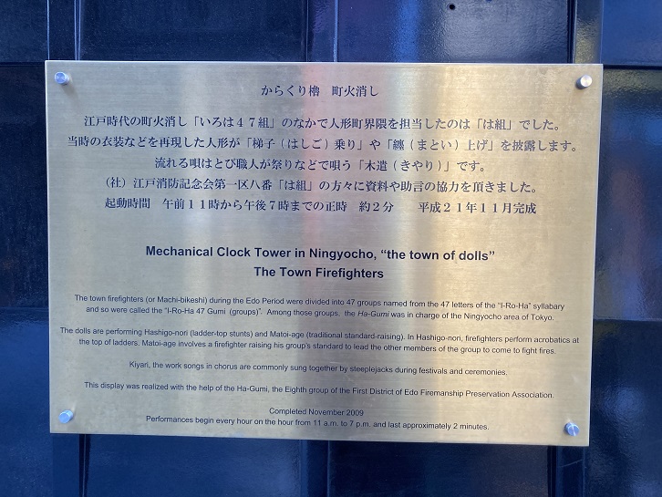The town firefighters (or Machi-bikeshi) during the Edo Period were divided into 47 groups named from the 47 letters of the "I-Ro-Ha" syllabary and so were called the "I-Ro-Ha 47 Gumi (groups)". Among those groups, the Ha-Gumi was in charge of the Ningyocho area of Tokyo.
