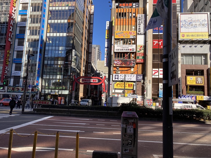 靖国通りに面して歌舞伎町一番街の派手なアーチが架かっています。昼間はそうでもないのですが、夜になると妖しいネオンが輝き出します。歌舞伎町には飲食店・遊技施設・映画館などが集中し、札幌のすすきの・福岡の中洲と並んで「日本三大歓楽街」と称される日本一の歓楽街です。この一帯は元々「大久保」の名の由来となる窪地の湿地帯と元大村藩主大村氏邸があったところでした。明治以降は鴨場となっていましたが、1893年に淀橋浄水場の建設に伴い、残土で鴨場の池が埋め立てられて現在の土地が造成されました。1945年の東京大空襲で一面焼け野原となりましたが、戦後になって石川栄耀や鈴木喜兵衛らによって「(現在の歌舞伎町一番街付近に)歌舞伎の演舞場を建設し、これを中核として芸能施設を集め、新東京の最も健全な家庭センターを建設する」という復興事業案がまとめられました。この都市計画から、計画担当者の石川栄耀の提案により、新しい町は歌舞伎町と名付けられました。結局、資金不足によってこの構想は実現せず、新宿コマ劇場が建設されるにとどまりました。