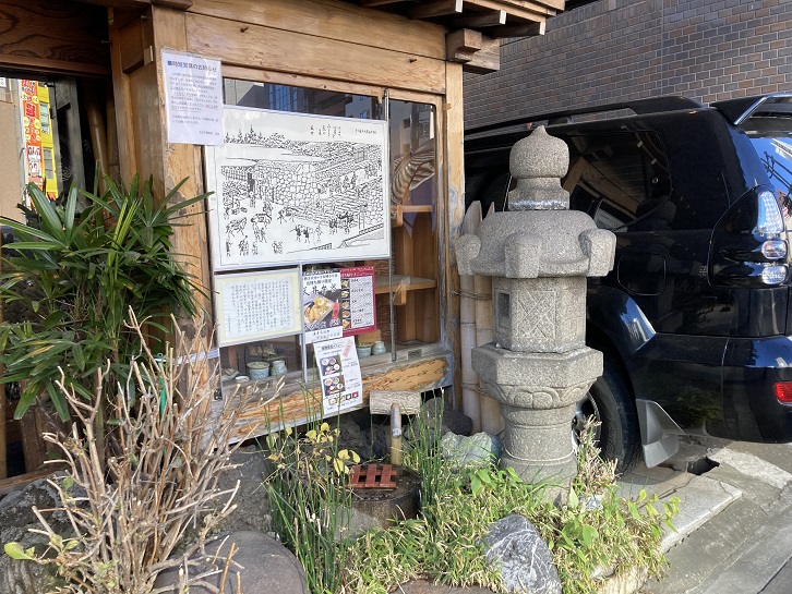 四谷四丁目交差点傍の蕎麦(うまい!)屋さんのメニューサンプルウインドウに江戸時代の風景を描いた絵が貼ってあります。この附近には、街道を通って江戸に出入りする通行人や荷物を取り締まるための関所である四谷大木戸がありました。