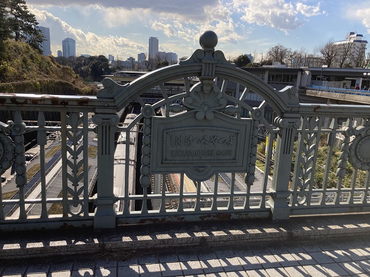 四谷見附橋は、JR中央線の上を通る新宿通り(国道20号)に架かる橋です。現在の橋は1991年に架け替えられた二代目の橋になります。寛永十六年(1639年)、現在の四ツ谷駅東側の江戸城外濠内側に江戸城三十六見附のひとつの四谷御門が造られ、見附番所が置かれました。北側に尾張徳川家・南東側には紀州徳川家の屋敷があり、江戸城防衛の要のひとつでしたが明治に入って門は撤去されました。明治二十七年(1894年)、外濠の一部の水を抜いて甲武鉄道(現在のJR中央本線)飯田町駅〜新宿駅間が開通し、その中間部に四ツ谷駅が開設されました。新宿方面から江戸城への道は防衛上の理由からクランク状に曲がっていて、交通の障害となっていました。1910年に四谷見附橋の建設を含む道路整備計画が東京市会を通過し、翌1911年に着工・大正二年(1913年)に完成しました。橋上には東京市街鉄道により新宿と月島を結ぶ路面電車が敷設され(都電11系統!)、1968年まで運行されました。1974年、新宿通りの拡幅と四谷見附橋の架け替えが決定し、架替工事は1991年10月5日に竣工しました。旧橋の橋体は八王子市の多摩ニュータウンにある長池公園に移築されました。初代の橋は400メートルほど離れた赤坂離宮との調和を図り、高欄や橋灯はネオ・バロック様式が採用されました。橋台は隅を花崗岩で押さえた煉瓦積みの外殻で、アーチは茶褐色に塗装されました。現在の橋は旧橋のアーチをイメージしたラーメン構造とし、高欄や橋灯は旧橋のものが再利用されています。