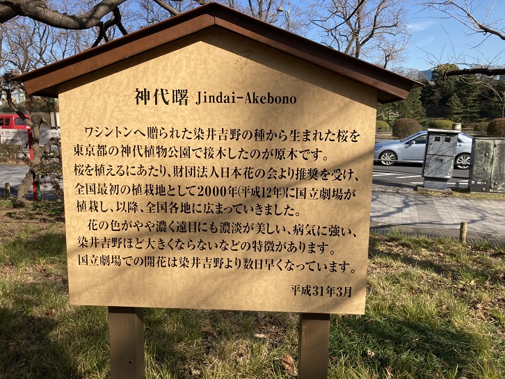 ワシントンへ贈られた染井吉野の種から生まれた桜を東京都の神代植物公園で接木したのが原木です。桜を植えるにあたり、財団法人日本花の会より推奨を受け、全国最初の植栽地として平成十二年(2000年)に国立劇場が植栽し、以降、全国各地に広まっていきました。花の色がやや濃く、遠目にも濃淡が美しい・病気に強い・染井吉野ほど大きくならないなどの特徴があります。国立劇場での開花は染井吉野より数日早くなっています。
