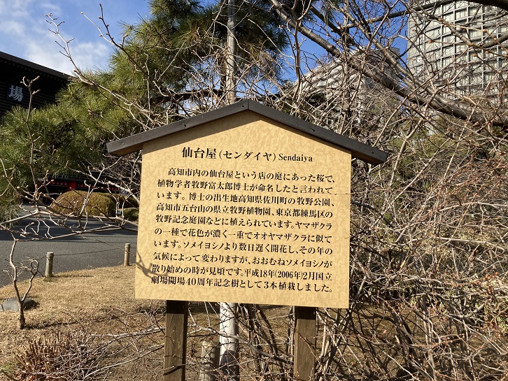 高知市内の仙台屋という店の庭にあった桜で、植物学者牧野富太郎博士が命名したと言われています。博士の出生地高知県佐川町の牧野公園・高知市五台山の県立牧野植物園・東京都練馬区の牧野記念庭園などに植えられています。ヤマザクラの一種で花色が濃く、一重でオオヤマザクラに似ています。ソメイヨシノより数日遅く開花し、その年の気候によって変わりますが、おおむねソメイヨシノが散り始めの時が見頃です。平成十八年(2006年)2月国立劇場開場40周年記念樹として3本植栽しました。