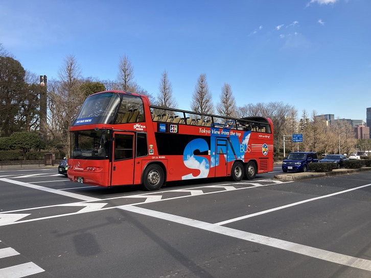 都電11系統は国会議事堂の正門前で左折し、内堀通り方向に進みます。コロナ禍以前は都内観光の定番でしたが、今は訪れる観光バスも殆どなく閑散としています。そんな中、乗客は数えるくらいですが真っ赤な色合いの観光バスが走っています。日の丸自動車興業株式会社が運営する「屋根なし2階建て」スカイバスです。観光業界は今コロナ禍で大変な事態に陥っていますが、また沢山の観光客が都内の名所を訪れてくれるようになるといいですね。日の丸自動車はこの他に、「水陸両用バス」のスカイダックも運行しています。