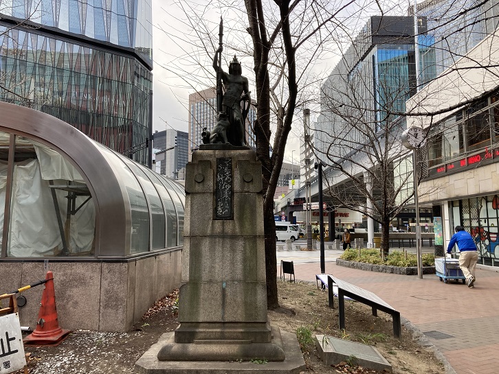 数寄屋橋交差点近くの交番脇に奇妙な姿をした銅像が建っています。足元には百獣の王の獅子を従え、兜をかぶった力強い男性像です。台座には、標語「不意の地震に不断の用意」の銘板も埋め込まれています。この標語は懸賞募集されたもので、銅像を制作した北村西望の自筆で書かれました。また、北村西望は台座の設計も行ったそうです。