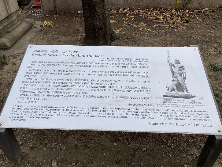 This statue was carved by Kitamura Seibo (1884 -1987) to submit to the 12th Imperial Art Exhibition, when he was 47 years old (1931). It was put in Sukiyabashi Park on September 1st, 1933, as a merorial monument of the 10th anniversary of the Great Kanto Earthquake. This sculpture depicts realistic and spiritual portrait which he was good at. He was born in 1884 in Nagasaki Prefecture, and he learned at Kyoto City College of Fine Arts and Crafts and Tokyo Fine Arts School. He produced many great sculptures, especially "Peace Statue" in Nagasaki City, produced in 1955, is one of his best works.