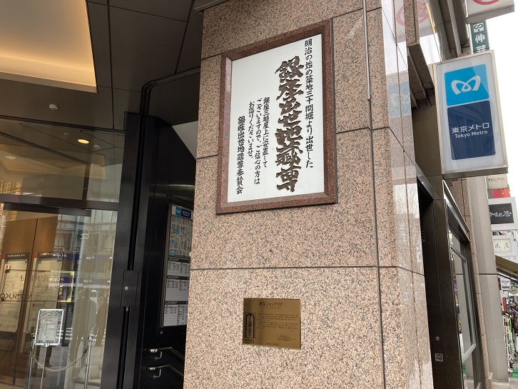 銀座四丁目交差点に来ました。交差点に面した三越の入口横に2枚のプレートが貼られています。銀座出世地蔵尊は三越の屋上の社に祀られています。地蔵尊は明治の初めに鳶頭の田中善太郎が地中から掘り出したとされています。近くの空き地に地蔵尊を安置したところ、心篤い人達が花や団子を供え参詣するようになりました。その後、この地蔵尊が開運・出世・延命・商売繁盛のあらたかな御利益があるということが喧伝され、お堂が建立され、さらに毎月7日・18日・29日が縁日となって賑わいをみせるようになりました。最盛期には、京橋から新橋までの片側に夜店が246軒も並び、「銀座八丁露店」として発展しました。関東大震災と昭和二十年5月25日の東京大空襲で銀座一帯は焼け野原となり、地蔵尊も行方知れずになりましたが、無事にお堂跡で発見されます。その後、幾多の変遷を経て三越の屋上に祀られるようになったのです。