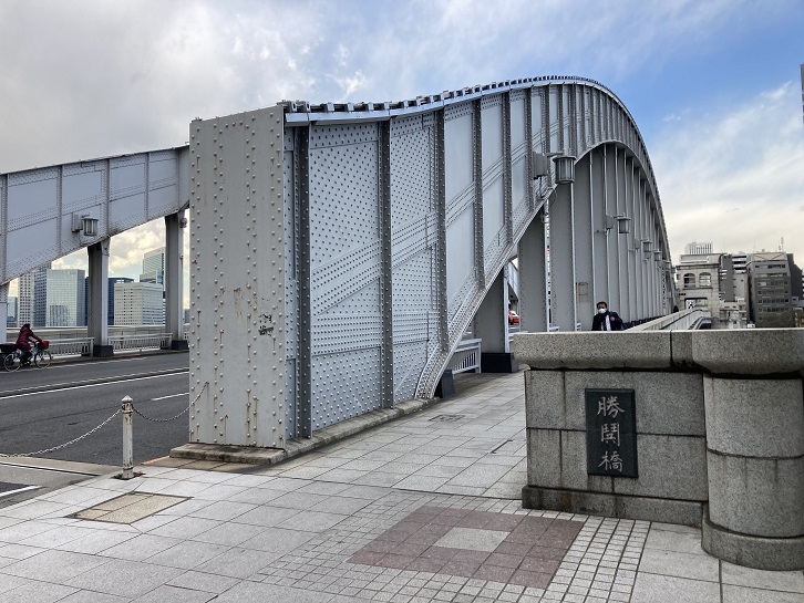 隅田川に架かる勝鬨橋を渡ります。勝鬨橋を通っていた都電は、11系統の他は9系統のみでした。車道上の横桁には今でも架線を取り付けた跡が見てとれるそうですが、どこに跡があるのかよく確認できませんでした。