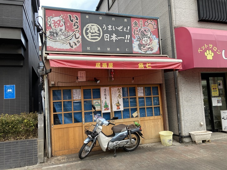 とはいっても、月島にはまだまだ少なからぬ昭和の名残りが残っています。清澄通りに面した小さな店構えですが、魚仁は月島の人気居酒屋です。一見して下町のお魚屋さんのような外観の店内には長机と簡易イスが置いてあり、昭和の雰囲気が満点で、いつも多くのお客さんで賑わっています。メニューは刺身の盛り合わせ・鰤大根・鮪ホッべ刺・マグロの脳天などといった多彩な海鮮ものが揃います。どれも下町価格で、ボリューム満点です。また、もつ煮込みやチャーシューなど、煮つけなども揃っています。魚仁の昼間の外観は活気にあふれた魚屋さんそのものです。「うまいぜぇ!日本一!!」の看板が掲げられた店舗では威勢の良い店員さんが新鮮な魚介類を次々と売りさばいています。夜になり、店頭販売が終わると居酒屋に早変わりし、店舗の外までテーブル席が張り出して、気軽に立ち寄りたくなる大衆居酒屋の趣となります。私も随分前に一度だけお邪魔しましたが、東南アジア系の女性店員の元気溢れる接客が印象に残っています。