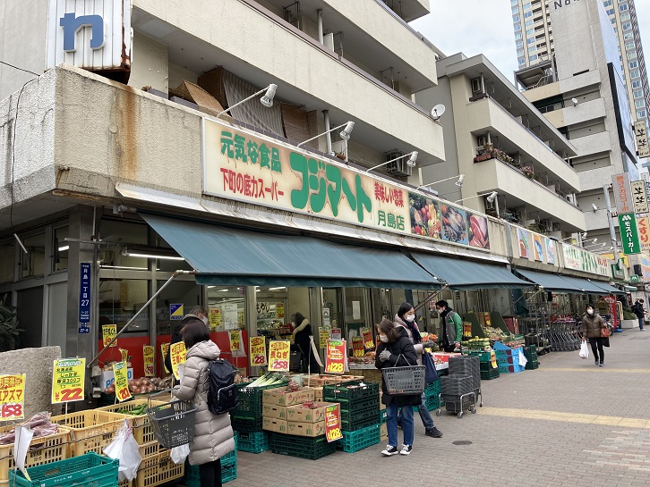 フジマート月島店のモットーは「下町の底力スーパー」です。店頭に並べられた野菜・果物はどれも新鮮で安いですね。お散歩の途中ですが、夕食のお買い物もしていきましょう。今の時季(1月)は芽キャベツと菜の花ですね。マヨネーズと辛子で和えたほろ苦い味はお酒のつまみにぴったりです。