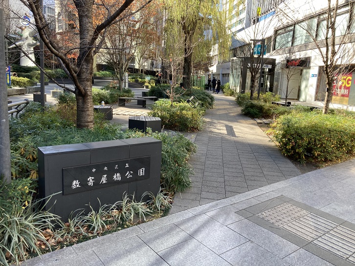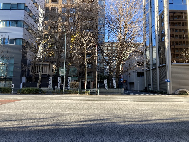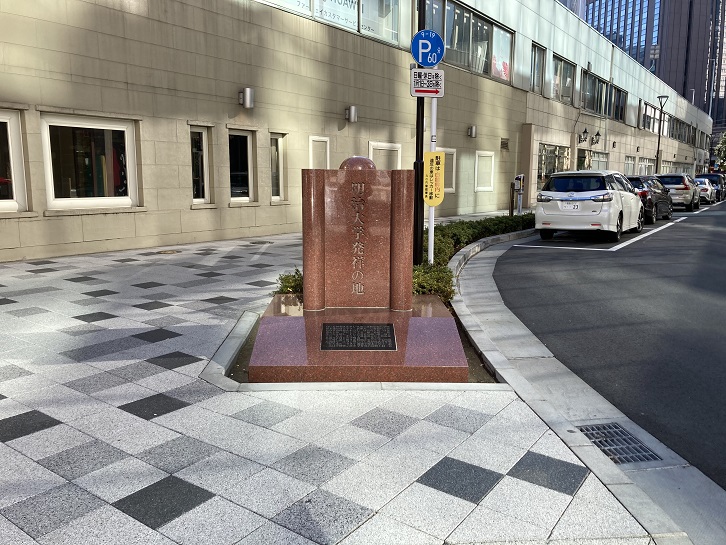 数寄屋橋公園の手前の歩道上に明治大学発祥の地の碑が置かれています。さすが明大建学の碑、ピッカピカに磨かれていますね。