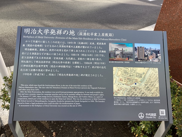 もうひとつの明大発祥の地の案内板が石碑の横に置かれています。同じような内容ですが、こちらは千代田区が設置したものです。