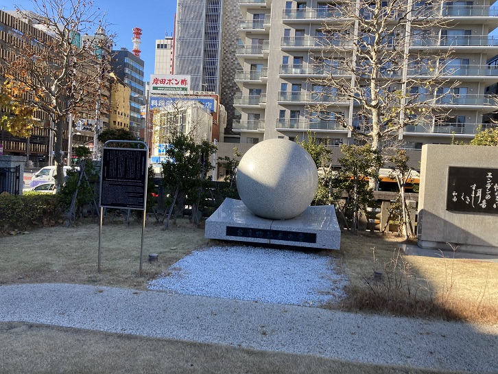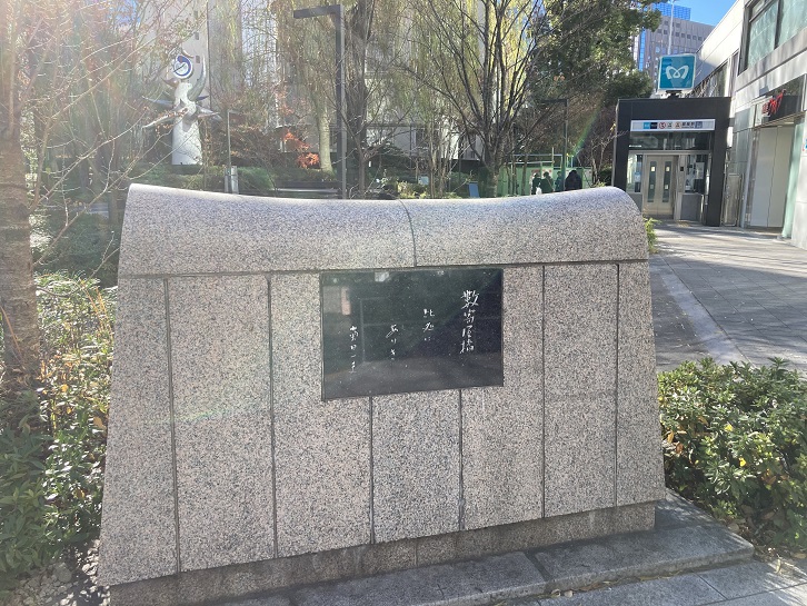 数寄屋橋公園の一角に、「君の名は」の脚本を書いた菊田一夫の石碑が置かれています。「数寄屋橋 此処に ありき 菊田一夫」と書いてあります。数寄屋橋は、その昔は銀座から江戸城の数寄屋橋御門に続く道の途中にかけられていた橋です。菊田一夫は劇作家としてさまざまな芝居を書いたのですが、なんといっても有名な作品が、昭和二十七年から2年間にわたって放送されたNHKラジオドラマ「君の名は」です。数寄屋橋は、延々とすれ違いを続ける主人公の恋人二人が初めて出会った運命の場所でした。このドラマは昭和二十八年に佐田啓二と岸恵子の主演で映画化もされ、空前の大ヒットとなりました。このようにして数寄屋橋の名は昭和のドラマによって全国に知られるようになったわけですが、「数寄屋」という橋の名は、近くに住んでいた茶人の織田有楽斎(織田信長の弟)が営んだ数寄屋造りの茶室に由来するともいわれる江戸以来の由緒ある名前です。また、有楽町という町名は「有楽斎」の邸宅があったことから名付けられたのです。更にいうと、数寄屋橋公園に隣接する泰明小学校は、北村透谷や島崎藤村の母校として知られていますが、透谷というペンネームは、「すきや」をもじってつけたものだそうです。
