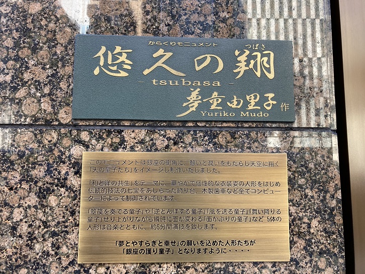 このモニュメントは銀座の街角に、憩いと潤いをもたらし天空に翔く「天の童子たち」をイメージし制作いたしました。「和と洋の共生」をテーマに、華やかで個性的な衣装姿の人形をはじめ、伝統的技法の七宝をあしらった飾り台、木製歯車など全てコンピューターによって制御されています。「箜篌を奏でる童子」や「逆とんぼする童子」・「風を送る童子」・「舞い降りる童子」、せり上がりながら瞬時に面が変わる「面かぶりの童子」など5体の人形は音楽とともに、約5分間演技を致します。