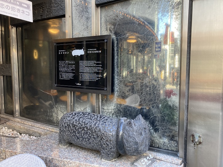 恋をサクセスさせるという縁結びのネコ「コイコリン」。1963年に三愛ドリーム館と共にこの場所に誕生以来、銀座の街を見守り続けています。コイコリンは館に向って右がオス、左がメスで、この前で待ち合わせをしたり、女性はオスを、男性はメスを願いを込めて撫でれば恋が成就するという「恋の招きネコ」です。産みの親は世界的な彫刻家の流政之先生。ノルウエイ産の御影(ミカゲ)石から彫り出されています。
