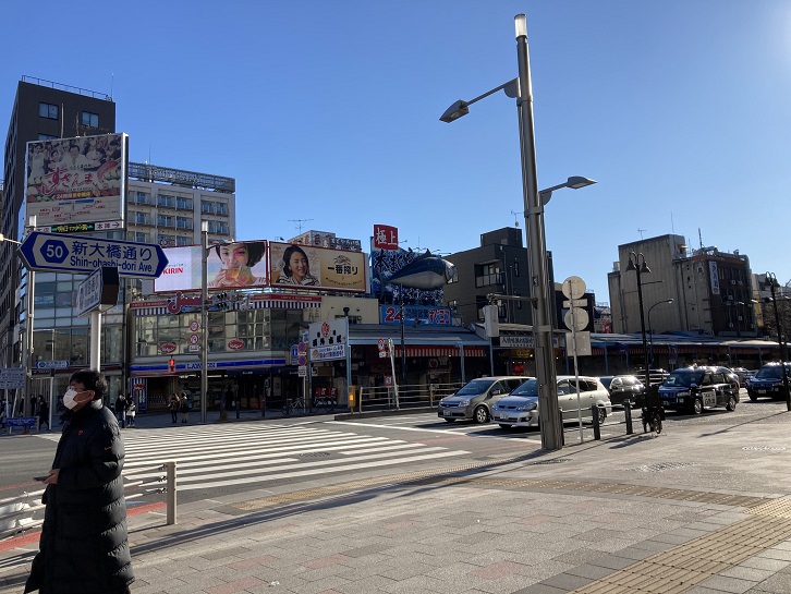 築地四丁目交差点で晴海通りから新大橋通りに入ります。築地場外市場は火災の跡は殆ど目立たなくなりましたが、やはりかっての勢いはなくなったように感じられます。時代の流れですかね。