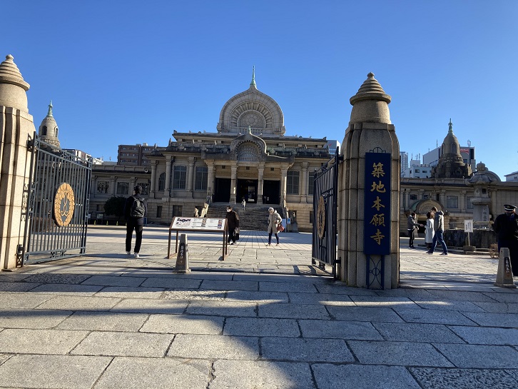 築地ができるきっかけになったのは築地本願寺の移設からです。築地本願寺は江戸時代の1617年に西本願寺の別院として浅草御門南の横山町(現在の日本橋横山町・東日本橋)に建立され、「江戸海岸御坊」・「浜町御坊」と呼ばれていました。しかし明暦の大火(振袖火事)により本堂を焼失し、その後江戸幕府による区画整理のため旧地への再建が許されず、その代替地として八丁堀沖の海上が下付されたのです。そこで佃島(現在の中央区佃)の門徒が中心となり、本堂再建のために海を埋め立てて土地を築き(この埋め立て工事が地名築地の由来)、「築地御坊」として1679年に再建されました。現在の本堂は1934年に竣工し。古代インド様式をモチーフとしたこの建物は当時の浄土真宗本願寺派法主・大谷光瑞と親交のあった東京帝国大学工学部名誉教授・伊東忠太による設計です。当時の宗教施設としては珍しい鉄筋コンクリート造で、松井組(現在の松井建設)が施工しました。大理石彫刻がふんだんに用いられ、そのスタイルは現在においても斬新かつ荘厳です。