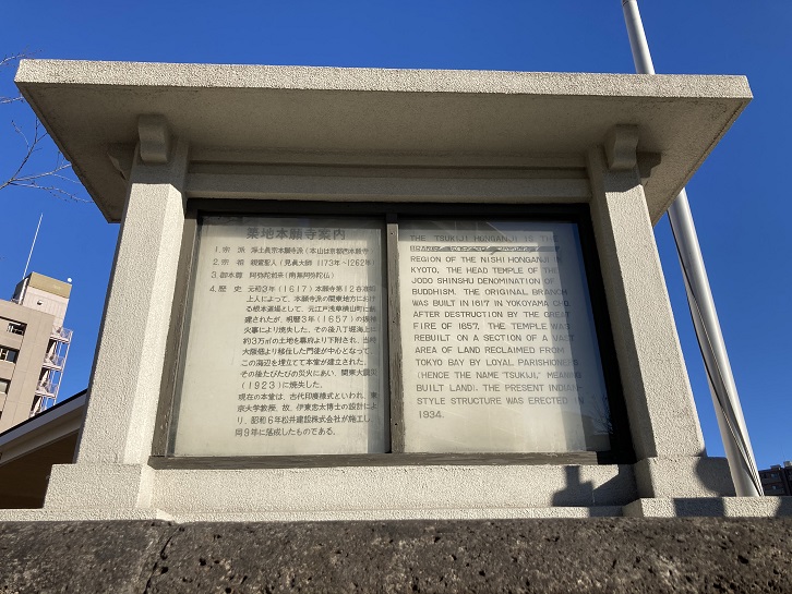 - 元和三年(1617年)本願寺第12世准如上人によって、本願寺派の関東地方における根本道場として、元江戸浅草横山町に創建されたが、明暦三年(1657年)の振袖火事により焼失した。その後八丁堀海上に約3万uの土地を幕府より下附され、当時大阪佃より移住した門徒が中心となって、この海辺を埋立てて本堂が建立された。その後たびたびの災火にあい、関東大震災(1923年)に焼失した。現在の本堂は、古代印度様式といわれ、東京大学教授、故伊東忠太博士の設計によリ、昭和六年松井建設株式会社が施工し、同九年に落成したものである。