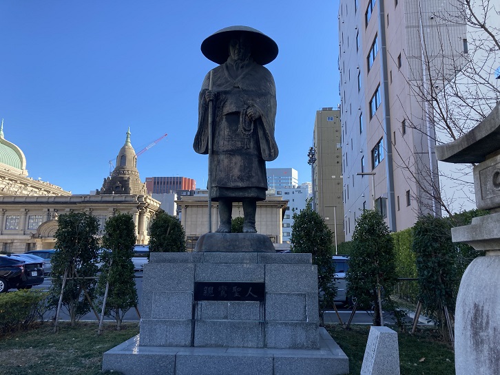 今まで築地本願寺の境内には入ったことがなかったので、立ち寄ってみます。築地本願寺の宗派は浄土真宗本願寺派なので、宗祖は親鸞聖人です。境内の端に親鸞聖人の巨大な像が立っています。その一角には親鸞聖人の歩んだ系統譜が記されています。親鸞は「歎異抄」を著したと学校で習ったような気がするのですが、親鸞の死後に弟子の唯円が書いたみたいですね。親鸞の教えは難解で、実子である善鸞でさえも理解できなかったようです。「歎異抄」とは、親鸞と「異」なる教えがなされたことを「歎」いた本という意味なんでしょうか?