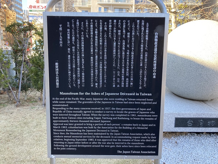 At the end of the Pacific War, many Japanese who were residing in Taiwan returned home while some remained. The gravesites of the Japanese in Taiwan had since been neglected and unmaintained. Responding to the many concerns received, in 1957, the then governments of Japan and Republic of China mutually agreed to conduct a survey to locate the graves of Japanese who were interred throughout Taiwan. When the survey was completed in 1961, mausoleums were built in three Taiwan cities including Taipei, Taichung and Kaohsiung, to house the remains of approximately thirteen thousand deceased Japanese. Approval was later granted to bring a portion of each person' s remains back to Japan and in March 1963, columbarium was built by the Association for the Building of a Memorial Monument Remembering the Japanese Deceased in Taiwan. Since then, the Mausoleum has been maintained by the Japan-Taiwan Association, which also conducts annual memorial services for the deceased. In accommodating request made by their relatives, beginning September 1985, it was approved that the remains of those who died after returning to Japan either before or after the war also be interred in the mausoleum. Following the ground development around the west gate, their ashes have since been relocated to the joint cemetery.