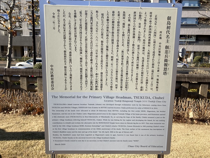 正保元年(1644年)に埋め立て造成された個島(現在の佃一丁目)は、将軍の命で摂津国西成郡佃村・大和田村から江戸に下った漁師たちによって築島されました。島内の地所は、先達を務めた個村の庄屋・森孫右衛門・実弟九左衛門・従弟(九左衛門の娘婿)忠兵衛をはじめ、摂津国からの移住漁師三十数名の割り当て所有となりました。その後、孫右衛門は本国佃村で没し、九左衛門は日本橋の本小田原町で魚問屋(「佃屋」)を開いたため、一族の衆望を担った忠兵衛が個忠兵衛を名乗って佃島の初代名主役を務めました。初代名主の佃忠兵衛は、将軍・幕府への御用漁や佃島の開発とともに、明暦三年(1657年)の大火で焼失した本願寺の替地の埋め立て(築地)と御堂の再建にも尽カしました。境内に立つこの石塔は、佃島の開祖である初代名主・佃忠兵衛の遺徳を称えて、文久元年(1861年)の二百年忌に十代名主・森幸右衛門勝鎮(九左衛門家が絶家のため七代目から森姓を継承)と親族の佃宇右衛門寛敏が建立した報恩塔です。正面には忠兵衛の法名と没年(「篤行院釋久西居士」/「寛文二年壬寅四月四日享年九十有四歳」)、側面には、開祖の遺徳や代々名主を奉職してきた歴史が刻まれています。なお、これまで石塔正面の法名は「森孫右衛門」のものと判断されてきましたが、名主家伝来の記録などから「佃島初代名主 佃忠兵衛」であることが明らかになりました。