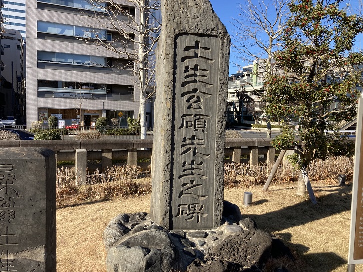 播州(兵庫県)赤穗藩主浅野内匠頭の江戸本邸跡。大石内蔵助をはじめとする家臣四十七士が元禄十五年(1702年)12月14日本所松坂町吉良邸に討入り亡君の仇を報じる忠臣蔵で名高い。