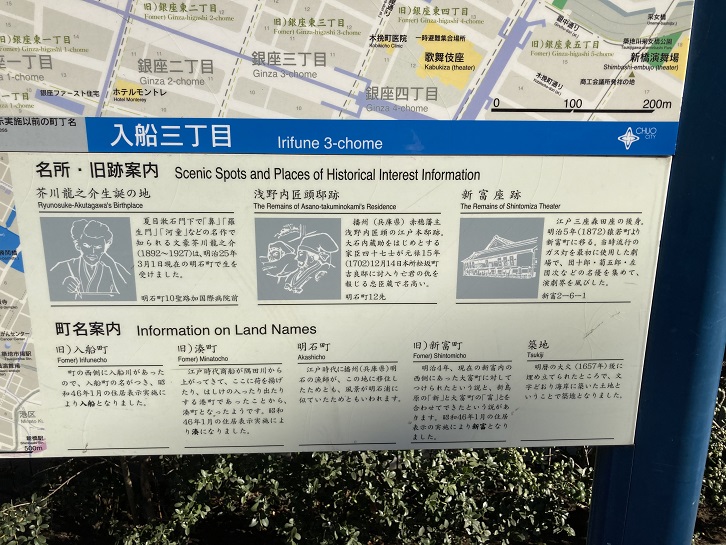 入船橋で築地川を渡ります。といっても、当時も埋め立てが進んでいて水は流れていなかったと思いますが。橋を越えると入船三丁目になります。道路脇にこの付近の名所・旧跡を紹介した案内板が立っています。入船川は関東大震災後に造成された新大橋通りの工事のために埋め立てられ、現在はその跡地に細長く連なってビルが建っています。
