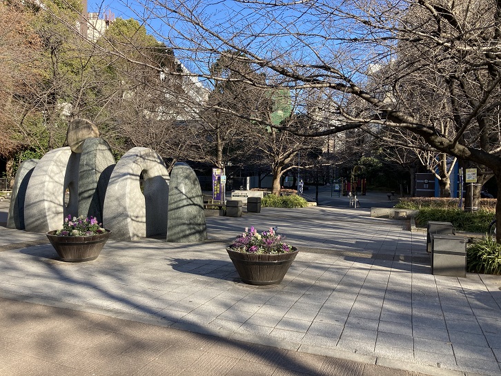 数寄屋橋公園の奥に見える「若い時計台」の彫像は岡本太郎の作です。昭和四十五年(1970年)に開催された大阪万博の「太陽の塔」にそっくりですが、この「若い時計台」はそれよりも4年早い昭和四十一年(1966年)の制作です。岡本太郎氏の「芸術は爆発だ」の掛け声と共に、あのギラッとした鋭い目つきは、強い印象を与えました。この塔は作られてからすでに40数年経っていますけど、周りの変化にもびくともせず、時代の流れを感じさせずに、より強烈なインパクトを与えています。当時の数寄屋橋界隈は「みゆき族」など最先端のファッションや文化が生まれる街として知られる一方で、集まる若者たちの風紀の低下が問題視されていたといい、時計台製作は「青少年の健全育成」が目的でした。岡本太郎は同所を訪れて「やたら色、形が混乱した雑踏の場。ひどい」と嘆きながら、「ただすっきりとしたものを作ったって埋もれてしまうだけ。激しいと同時に、静まった、周囲と異質でありながらピタリとあの場所に生きる、彩の濃い象徴を」と構想し、円柱スタイルの台から円すい状のオブジェがさまざまなに突き出す全長約8メートルの「若い時計台」を完成させました。作品の「顔」となる時計盤は、時間によって指針がまゆ毛、ヒゲなどに見え、夜間は作品全体を赤、黄、青、緑にライトアップされます。完成にあたっては、「人間は本来八方に意欲を突き出し、情熱をほとばしらせながら生きたいのだ。時間を超えた時間、機械的でない、人間的な時間を表象したつもり」とコメントを寄せました。