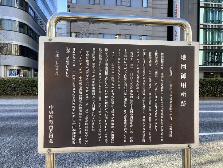 地図御用所は、実測による初めての日本全図を作製したことで知られる伊能忠敬(1745年〜1818年)の住居に設けられていました。伊能忠敬は、五十一歳の時に下総国佐原(現在の千葉県佐原市)から江戸深川黒江町(現在の東京都江東区)に居宅を移し、幕府天文方高橋至時の門に入って天文学を学び始めました。寛政十二年(1800年)からは本格的に日本全国の測量をはじめ、以降十七年間にわたって日本全国の沿岸を測量し、その総距離は約四万キロメートルにも及んだといいます。文化十一年(1814年)、九州地方の測量から帰った忠敬は、深川黒江町から八丁堀亀島町と呼ばれていた現在地付近へ転居しました。この屋敷の敷地は百五十坪ほどでしたが、忠敬の居住地としてだけではなく、測量図を作製するための地図御用所として利用されていました。忠敬は地図が完成する前の文政元年(1818年)に亀島町の居宅で死去してしまいましたが、その後も忠敬の居宅は地図御用所として使用され、文政四年(1821年)門弟や天文方の下役等の手により「大日本沿海奥地全図」が完成しました。