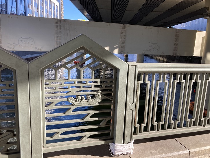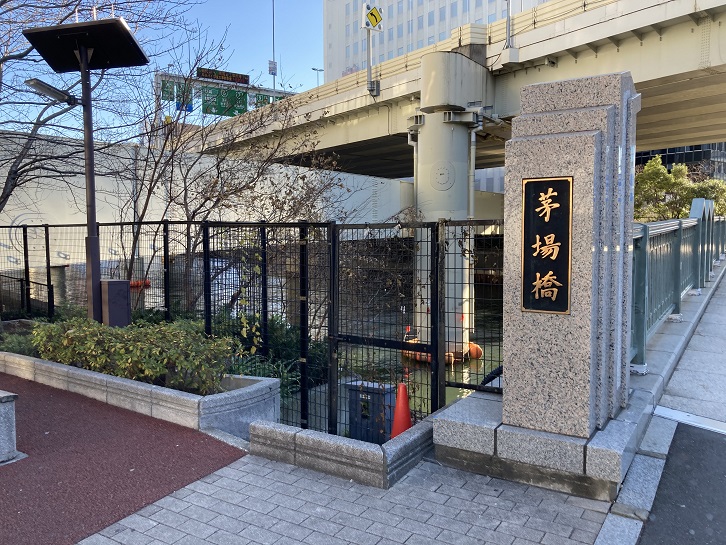 茅場橋で日本橋川を渡ります。日本橋川は埋め立てを免れましたが、船運の要所だったからかもしれません。茅場橋の欄干には小舟に乗って川を渡る一行を描いたレリーフが取り付けられています。茅場橋の橋名は町名の茅場町からとったようですが、茅場町の町名は、徳川家康の江戸城築城の際に神田橋門外にいた茅商人をこの辺りに移住させて市街地(町人地)としたことに由来するようです。江戸時代には瓦葺きよりも茅葺き屋根の方が圧倒的に多かったでしょうから、茅商人もそれなりに多くいたのでしょう。