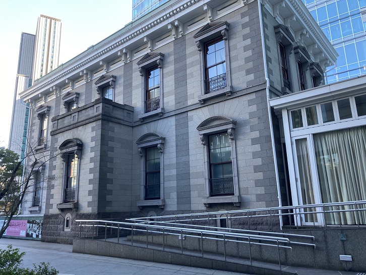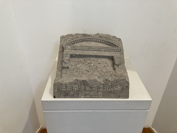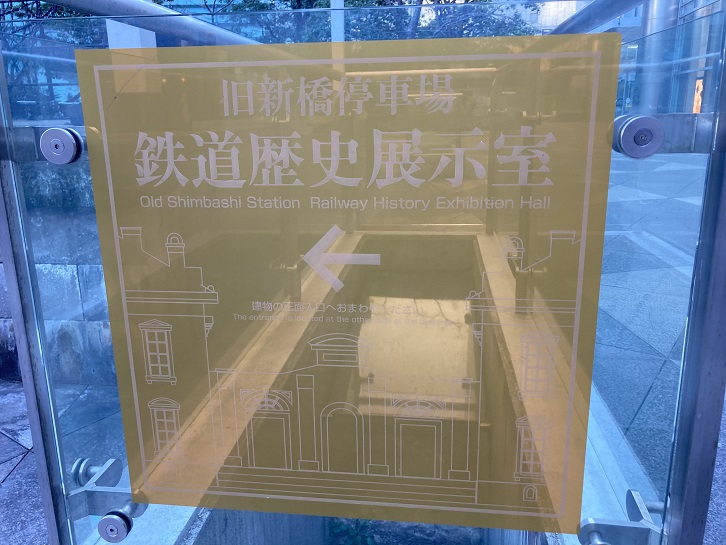 この建物は、明治五年(1872年)10月14日(太陽暦)に開業した日本最初の鉄道ターミナル新橋停車場の駅舎の外観を、当時と同じ位置に、できるだけ忠実に再現したものです。新橋停車場駅舎は、アメリカ人R・P・プリジェンスの設計により、明治四年(1871年)5月に着工、同年12月に完成し、西洋建築がまだ珍しかった時代の東京で、鉄道開業直後に西洋風に整備された銀座通りに向かって、偉容を誇っていました。大正三年(1914年)年、 新設の東京駅に旅客ターミナルの機能が移り、それまでの鳥森駅が新橋の名を引き継いで現在の新橋駅となり、貨物専用駅となった旧駅は汐留駅と改称、物流の大拠点として戦前戦後を通じて東京の経済活動を支えました。文明開化の象徴として親しまれた旧駅舎は、大正十二年(1923年)9月1日の関東大震災に際して火災のため焼失し、昭和九年(1934年)から始まった汐留駅改良工事のため、残存していたプラットホームや構内の諸施設も解体されました。昭和六十一年(1986年)、汐留駅はその使命を終えて廃止され、跡地の再開発工事に先立つ理蔵文化財の発掘調査が平成三年(1991年)から行われた結果、旧新橋停車場駅舎とブラットホームなど構内の諸施設の礎石が発掘されました。平成八年(1996年)12月10日、駅舎とプラットホームの一部の遺構が史跡「旧新橋停車場跡」として国の指定を受け、この史跡を保護しつつわが国鉄道発祥の往時を偲ぶために、駅舎を再建することになったものです。
